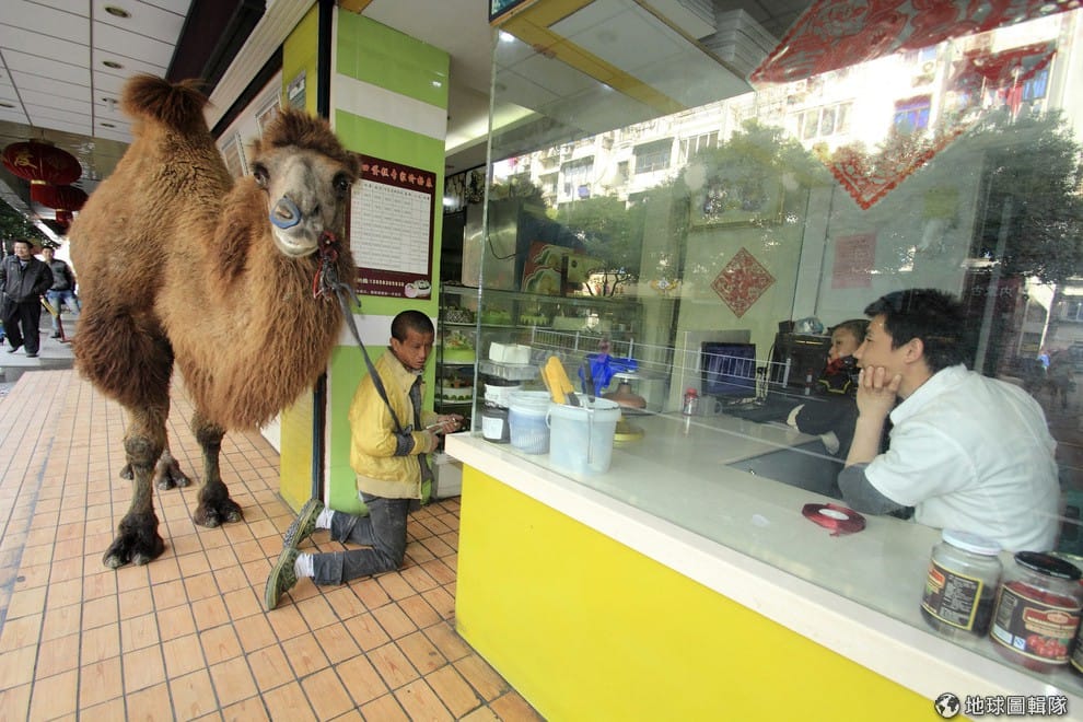 人們看著拉著駱駝的乞丐跪在店門外的地上,當地市區內在這幾天常見到這樣的景象