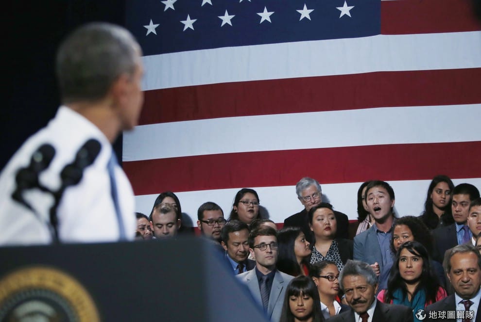 美國總統歐巴馬回望一名打斷他演講的男子,該名男性反對驅逐法案而打斷正在針對移民法致詞的歐巴馬