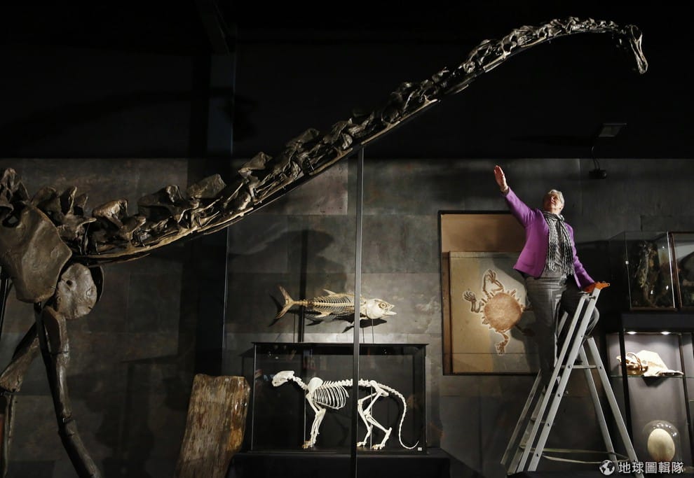 Summers Place中可以看到館員站在高達17公尺的梁龍(diplodocus)骷髏旁,當地即將進行拍賣會,這巨大的梁龍骷髏預計拍賣價格可以達到60萬英鎊(折台幣約1775萬元)