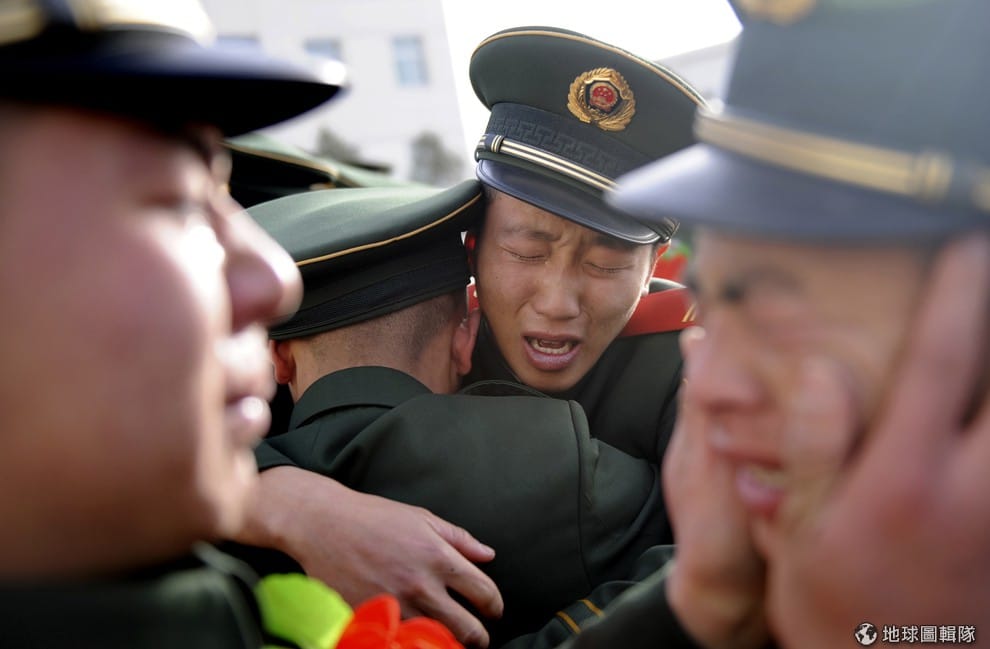 照片中的公安人員相擁而泣,他們正和退役的軍官道別