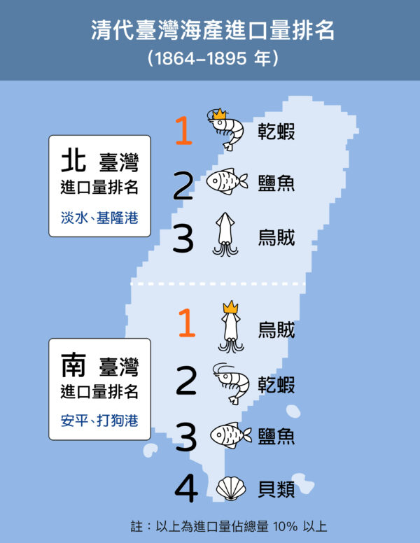 北臺灣進口大量魚貨,南臺灣則熱愛多樣化消費,比如各式各樣的貝類。而高檔進口海產如干貝、海參、鮑魚、淡菜等,臺灣南北都毫不手軟,足見清代海產貿易已走向全球化、高級化。
