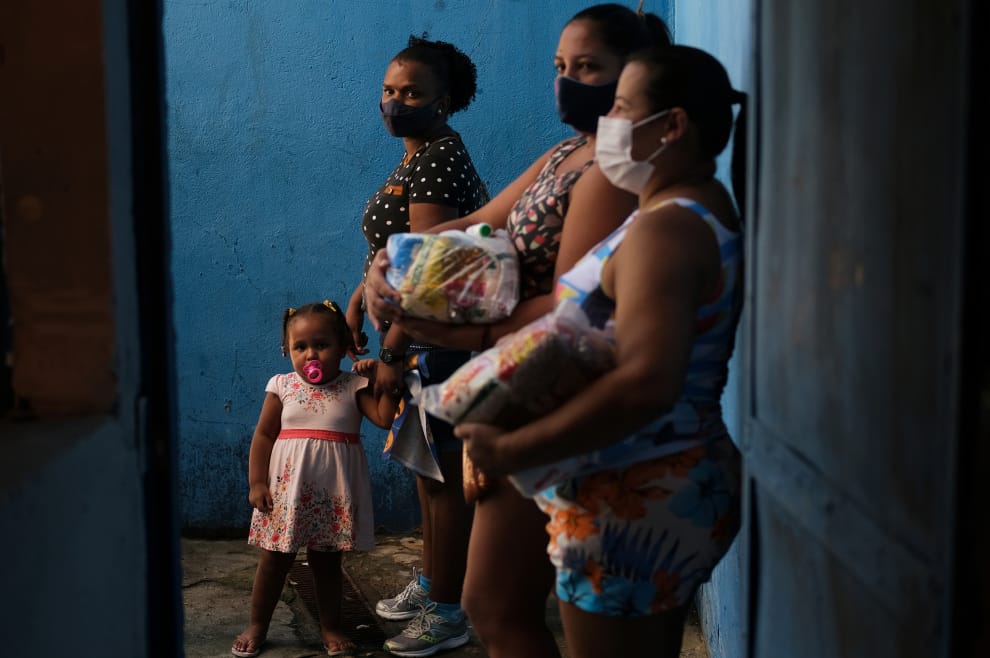 在巴西大城里約熱內盧的羅辛哈森巴學校(Rocinha Samba School),住在羅辛哈(Rocinha)貧民窟的民眾走進學校,準備領取非政府組織「愛的蜜蜂研究所」(Bees of Love Institute)提供的食物包。