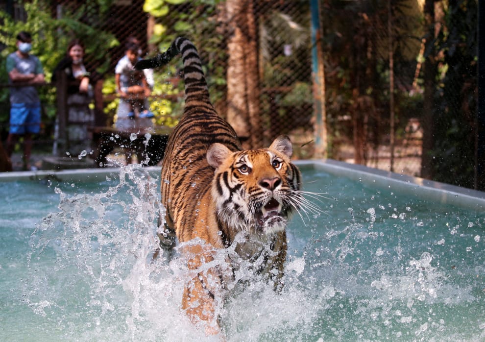 在泰國北部清邁市(Chiang Mai)的老虎動物園裡,一頭老虎開心地衝進水池裡,準備大玩特玩一番。