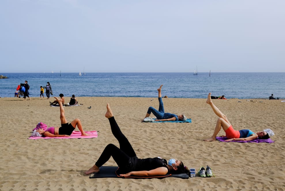 在西班牙大城巴塞隆納(Barcelona)的海灘上,一群婦女們一起躺在沙灘上做瑜伽。