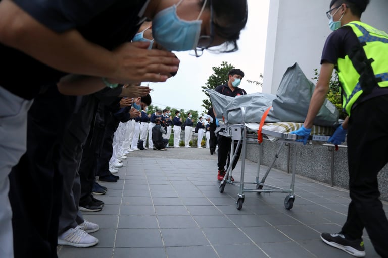 在花蓮台鐵太魯閣號火車出軌事故的現場,慈濟的成員們在救難人員抬出一具遺體時,紛紛雙手合十彎下腰,哀悼死者的離世。