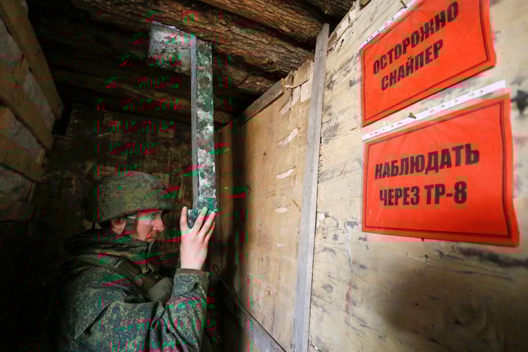 在烏克蘭東部的頓內次克市(Donetsk),一名頓內次克人民共和國(Donetsk People's Republic,DNR)的軍人正在用潛望鏡觀察四周動靜。