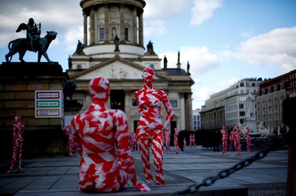 在柏林的御林廣場(Gendarmenmarkt square),藝術家梅瑟(Dennis Josef Meseg)進行了以COVID-19(武漢肺炎)為主題的「就像這樣」(It is like it is)裝置藝術展演。畫面中,人體模特兒被裹上了紅色與白色膠帶,以表現冠狀病毒所帶來的危機。