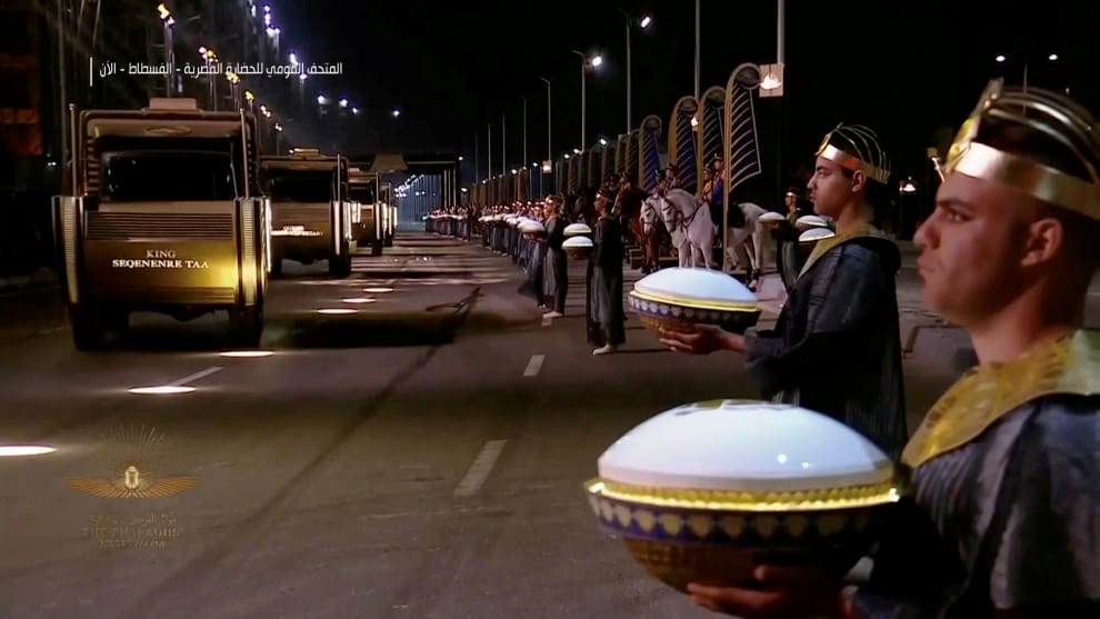 在 3號這天,首都開羅舉行了一場盛大的遊行,18位法老和 4位王后的木乃伊被放入一台台特製的車輛,從原本所在、座落於解放廣場的埃及博物館(Egyptian Museum),搬家到位在東南方福斯塔特(Fustat)的埃及文明國家博物館(National Museum of Egyptian Civilization),整趟旅途約耗時四小時。