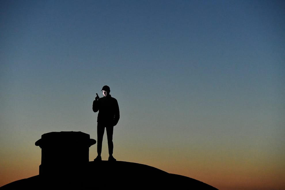 在沿海地區鄧萊里(Dun Laoghaire)的港口,一名男子為了接收到手機的訊號,正站在一處房屋的屋頂上,他的臉在昏黃的夜色中被手機螢幕的光給照亮了。