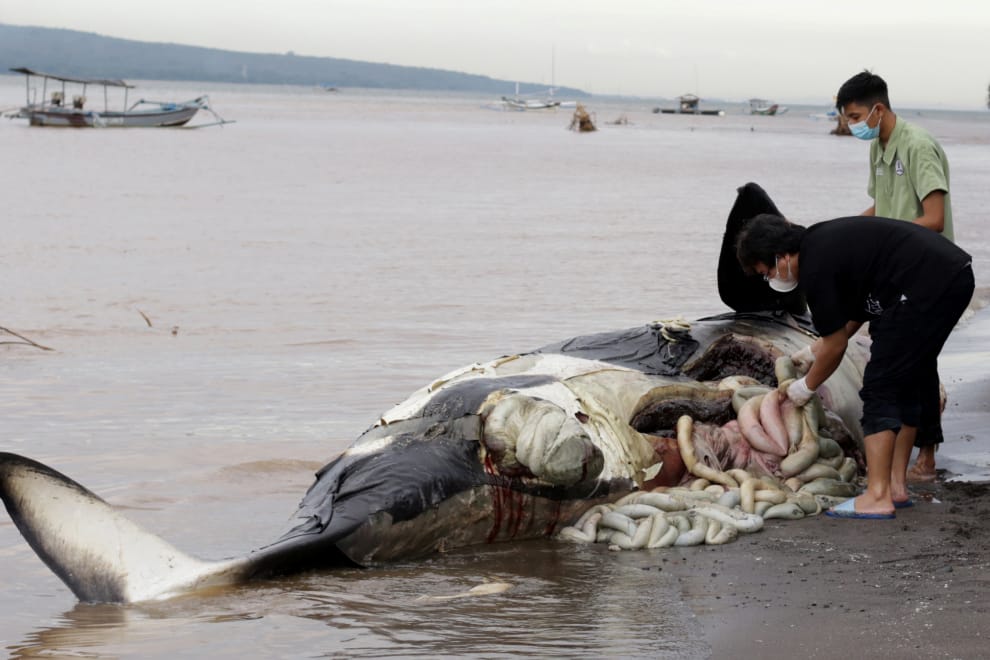 在東爪哇省(East Java province)的外南夢縣(Banyuwangi),一隻虎鯨擱淺在海灘上,而且已經死亡多時。畫面中,兩名獸醫正在對虎鯨進行採檢,以了解牠的詳細死因。