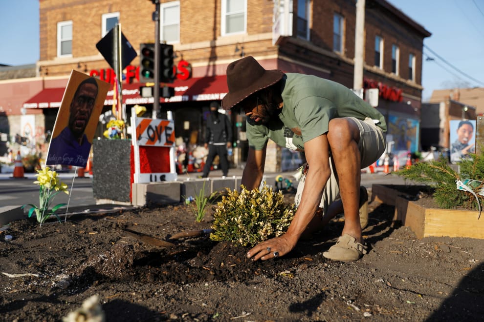 在明尼蘇達州的明尼亞波里斯(Minneapolis),一群民眾正在「喬治·佛洛伊德廣場」(George Floyd Square)中開闢小型花園。