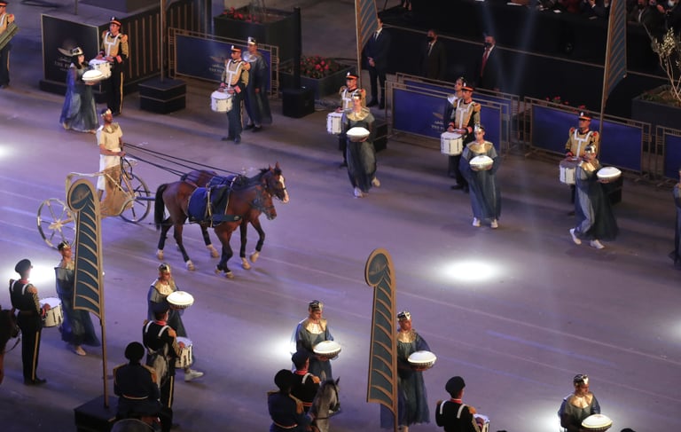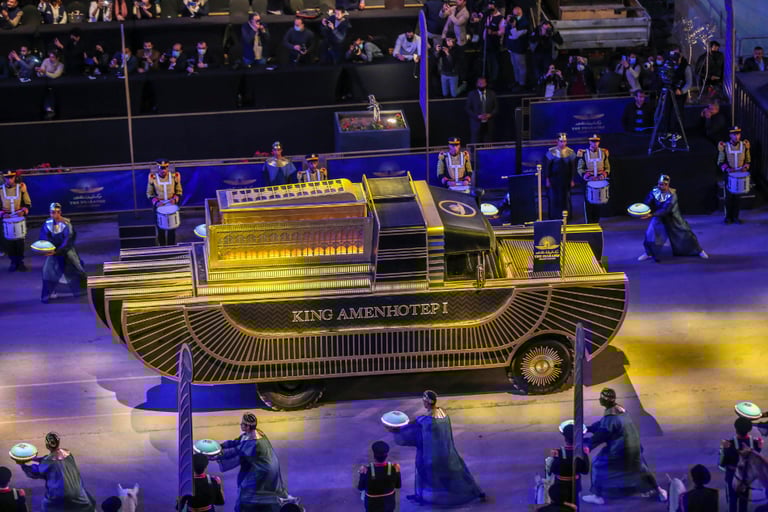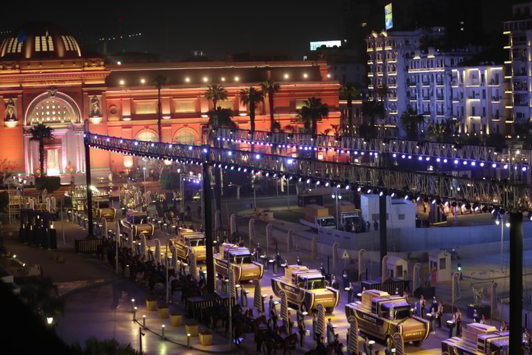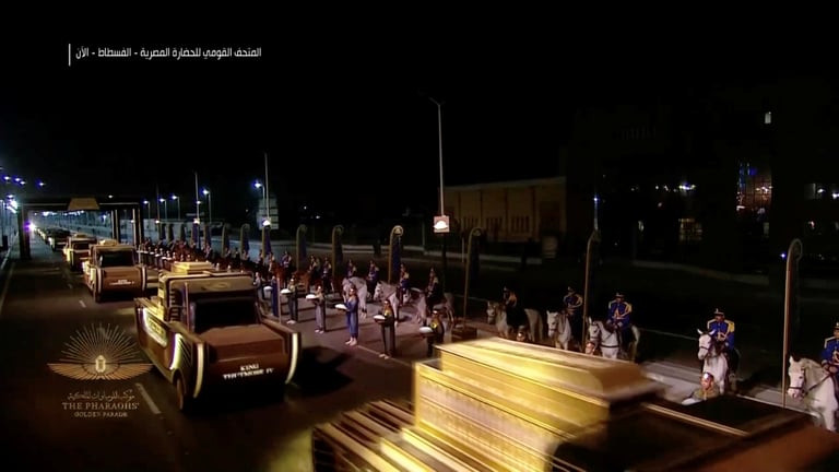 埃及史上鮮少出現過足以媲美上周六(3)的場面——在當晚的「法老的黃金遊行」(The Pharaohs' Golden Parade)上,22位先後統治古埃及的法老、王后木乃伊一齊搭著特製的汽車出現在埃及首都開羅街頭,浩浩蕩蕩地從埃及博物館(Egyptian Museum)出發,前往全新的埃及文明國家博物館(National Museum of Egyptian Civilization)。