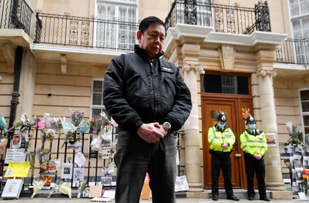 在倫敦的緬甸大使館外,突然被解職的前緬甸駐英國大使札瓦爾敏(Kyaw Zwar Minn)沉默地站著——事實上,從前一天(7)開始,他的副手(Chit Win)就已經拒絕讓他進入大使館內。