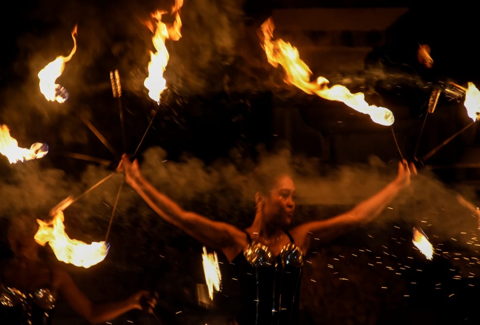 在西努沙登加拉省(West Nusa Tenggara)的西龍目縣(West Lombok),一間旅館為了要吸引旅客上門,在傍晚時分上演了精采的火舞秀,火焰的光與熱照亮了四周,跟黑色的夜晚形成了強烈的對比。