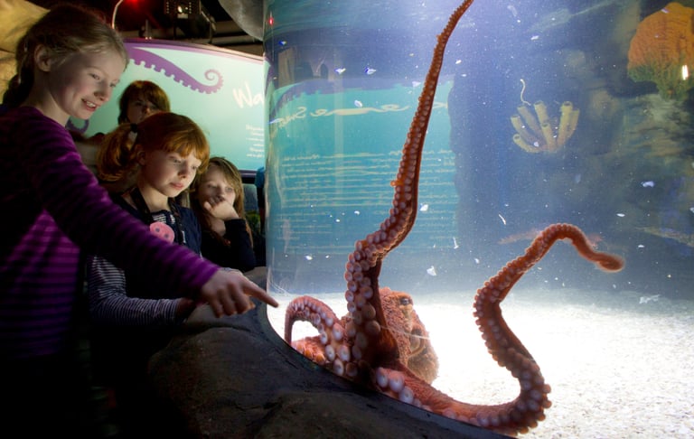 到了地理灣,卡爾森隨即換上泳裝,帶著 2歲的女兒走進海裡,並在偶然間發現了一隻在淺海處伸出腕足驅趕附近海鷗的章魚。正當卡爾森拿出手機,和女兒悄悄靠近、想要更仔細觀察牠時,章魚似乎不太高興了。