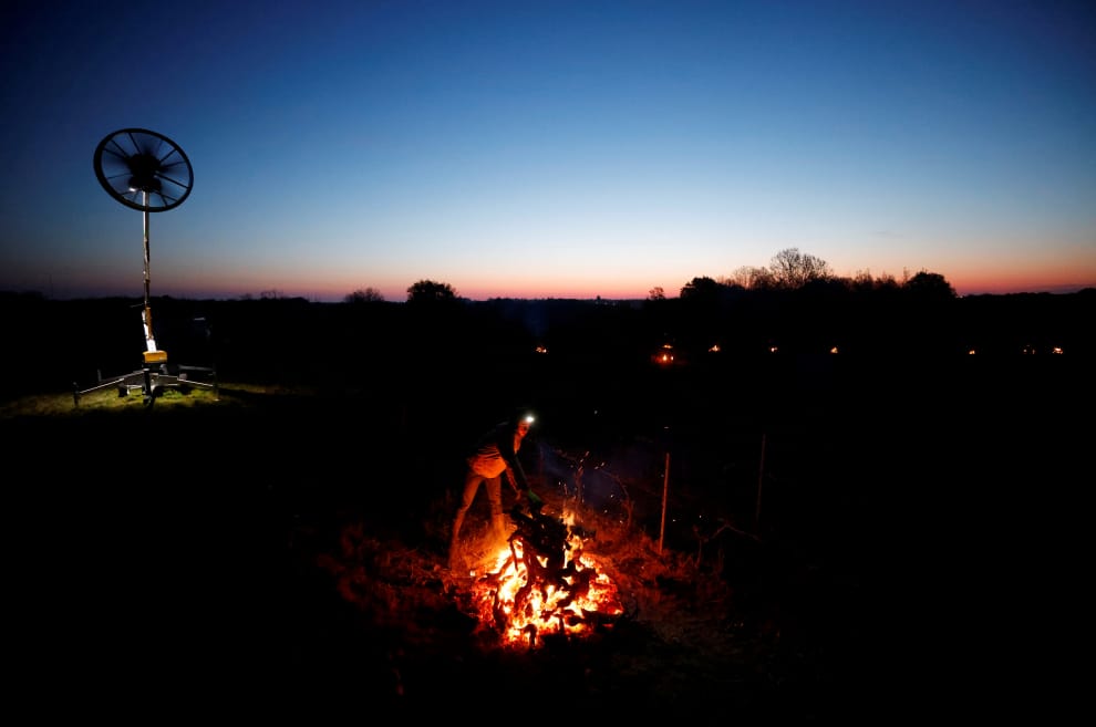 在大西洋羅亞爾省(Loire-Atlantique)的市鎮韋爾圖(Vertou),一名葡萄酒商正在他的田地旁燃燒火堆,希望這樣能夠帶來足夠的高溫,讓珍貴的釀酒用葡萄品種「密斯卡岱」(Muscadet)可以不要受到寒害的損傷。