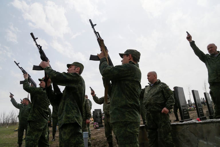 在城市斯塔車諾弗(Stakhanov),一群自稱隸屬於「盧甘斯克人民共和國」(Luhansk People's Republic)的親俄武裝分子聚集在一處墓地,在畫面中,他們正一起鳴槍為死去的同伴送行。根據他們透露,這位同伴是在他們與烏克蘭軍隊對峙時,遭到敵軍狙擊而死的。