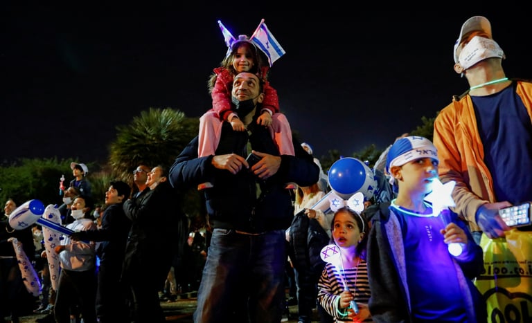 自 1948年以色列發表獨立宣言以來,每年以色列人都會遵循希伯來曆,以「以珥月(Iyar) 5日」作為他們的國慶日,而今年的以珥月 5日則是 4月14日傍晚到 4月15日傍晚。在這天,以色列特拉維夫市(Tel Aviv)的人們手舉著國旗跟小道具,一起在戶外欣賞國慶日的煙火。