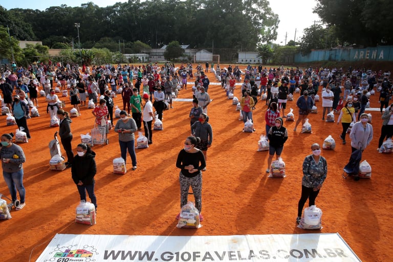 至於巴西的另一個角落,即里約熱內盧西邊的大城聖保羅(Sao Paulo),地方型非營利組織「G10 das Favelas」在赫里奧波里斯貧民窟(Heliopolis slum)發放食物袋,救助在COVID-19(武漢肺炎)疫情期間謀生陷入困難的居民。