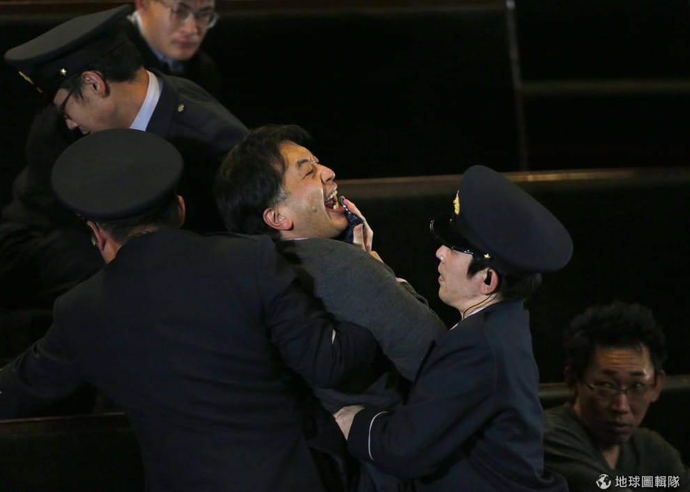 一名示威者大喊出聲,他反對政府要通過一項秘密法案,一旁的警察把他架出場。日相安倍晉三政府計畫通過一項秘密法案,這條新法會限制人們接觸許多議題,包含與中國之間的衝突、福島核災爭議等等。這項法案通過後,也等於擴大政府秘密的定義,同時要是新聞業觸法可能要面對5年徒刑