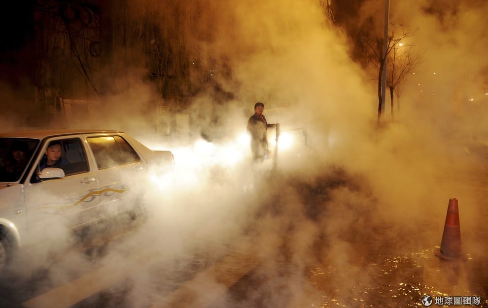 一輛車呼嘯而過,一旁可看到一名女性站在厚重的水蒸氣中。陝西省的太原地區發生熱水管線外洩事件,約70度C的熱水流到了大街上,還讓路人受傷