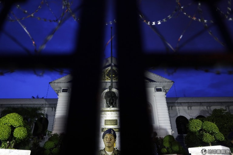 維安人員站在政府大門前,曼谷當地出現大規模的示威抗議,反政府的民眾要現任總理盈拉下台