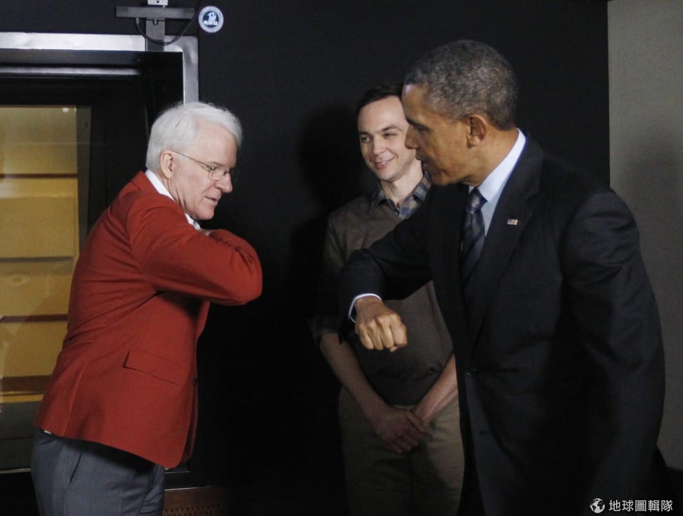 美國總統歐巴馬和影相和影星史提夫馬汀(Steve Martin)互碰手肘,歐巴馬這天來到夢工廠公司參觀,在動畫電影Home擔任配音員的馬汀說他比較想和歐巴馬互碰手肘不要握手