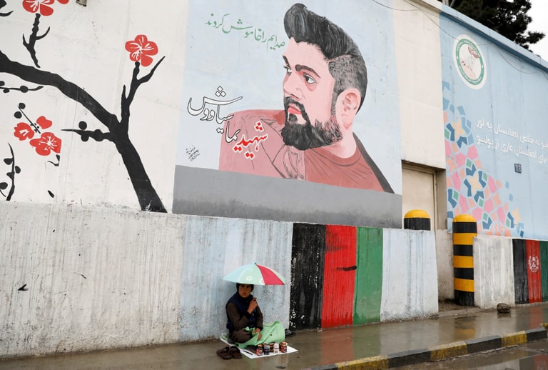 在首都喀布爾(Kabul),一名小小擦鞋匠獨自撐著傘坐在路邊。他正耐心地等待路人駐足,並成為他的下一位顧客。
