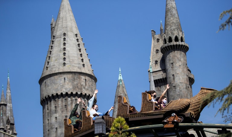 照片攝於影城內的「哈利波特魔法世界」(The Wizarding World of Harry Potter)園區。畫面中,人們正在享受雲霄飛車「鷹馬的飛行」(Flight of the Hippogriff)的樂趣。
