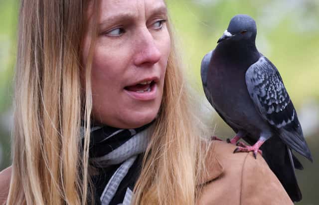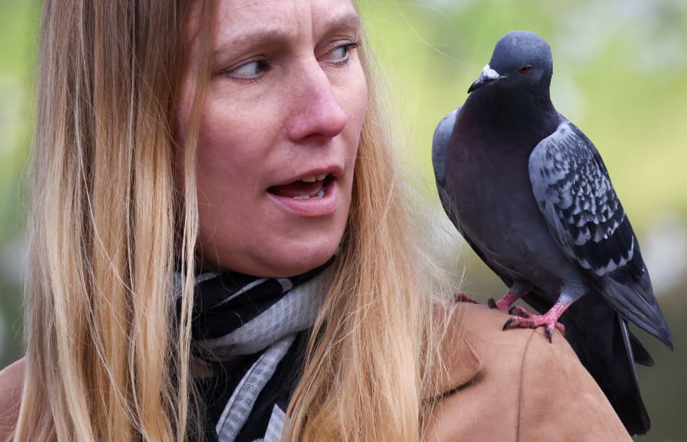 在倫敦的聖詹姆斯公園(St. James's Park),一隻鴿子大剌剌地停在了一名女子的肩膀上,即使對方驚訝地轉頭看向牠,這隻鴿子也還是無動於衷。