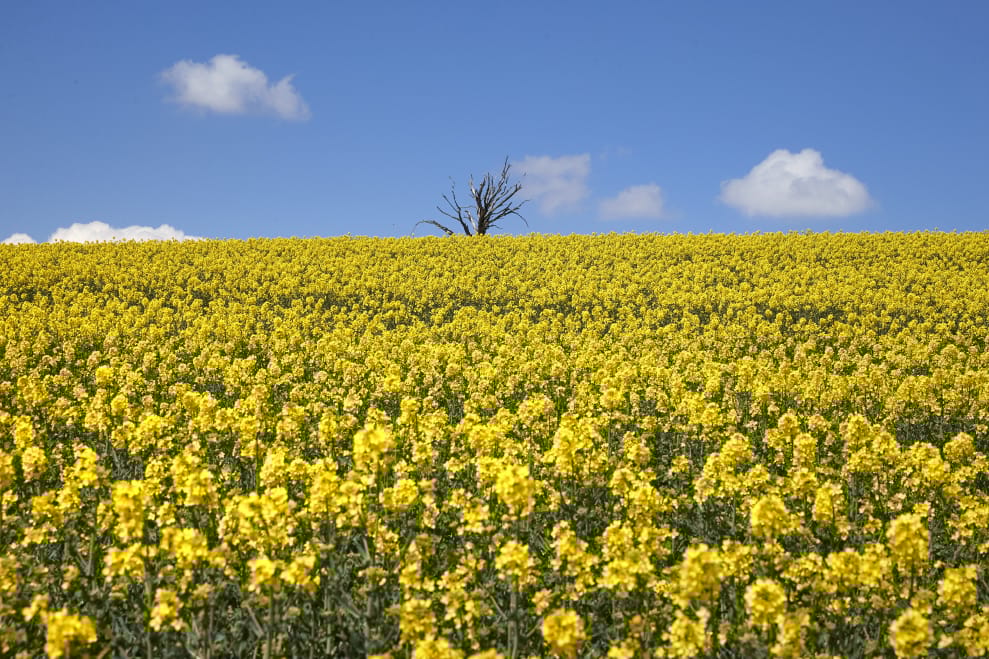 在城鎮梅克斯(Mex),油菜花季已經正式到來,鮮黃的花朵開滿了整片土地,跟天空的水藍色形成了突出的對比。