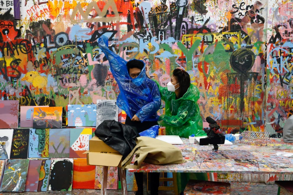 在首都雅加達(Jakarta)的摩加博物館(Moja museum),兩名遊客在五顏六色的展區中套上了雨衣,以避免自己的衣服不小心沾染到周圍的顏料。