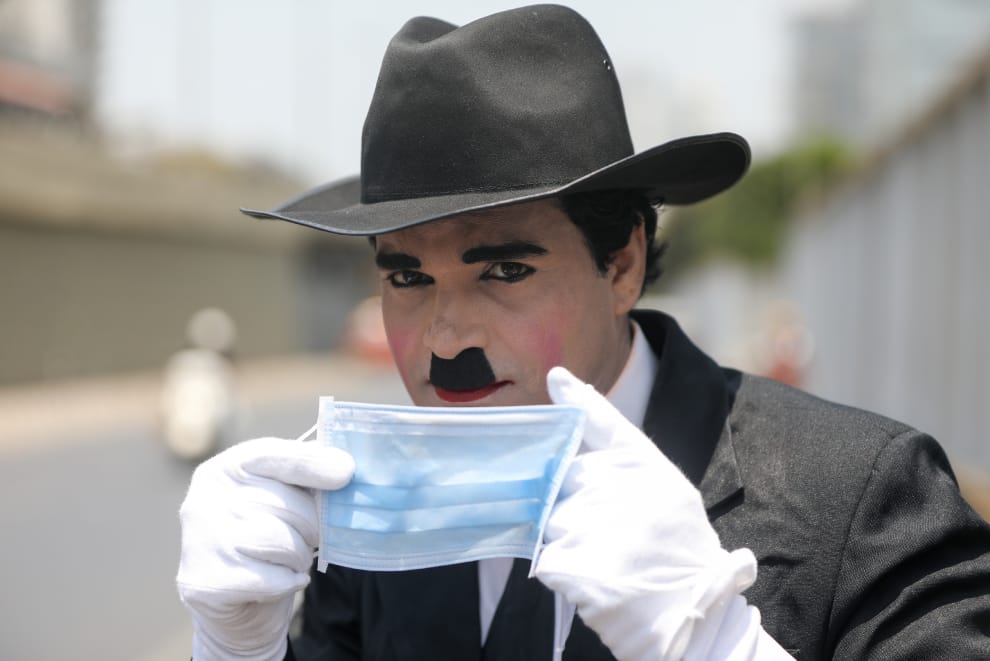 這天是默劇泰斗卓別林(Charlie Chaplin)的 132歲冥誕。在印度的城市孟買,一名男子裝扮成他的模樣,在大街上提醒路過的民眾隨時配戴口罩的重要。