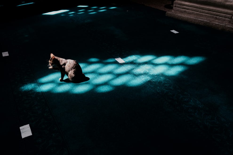 在伊斯坦堡的聖索菲亞大清真寺(Hagia Sophia Grand Mosque),一隻貓正站在窗格的光影下整理自己的毛。