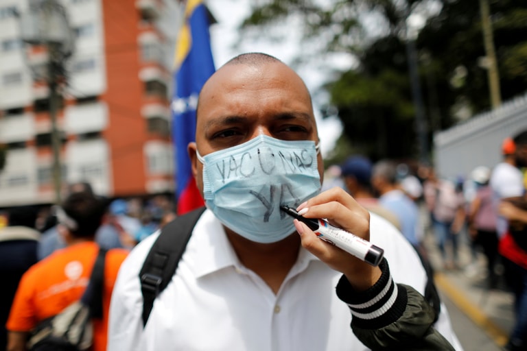 在首都卡拉卡斯,一名民眾在醫護人員的口罩上寫下「現在就打疫苗!」的口號,一起呼籲全民盡速接種COVID-19(武漢肺炎)疫苗。