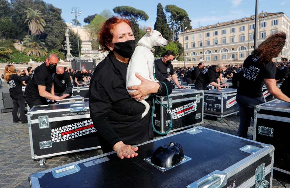 在位於羅馬的人民廣場,劇場工作人員齊聚一堂,在過去用於裝戲服和道具的黑色箱子上敲擊出聲音,要求政府放鬆防疫管制,讓劇場工作人員和藝術家們能夠回到舞台上表演。