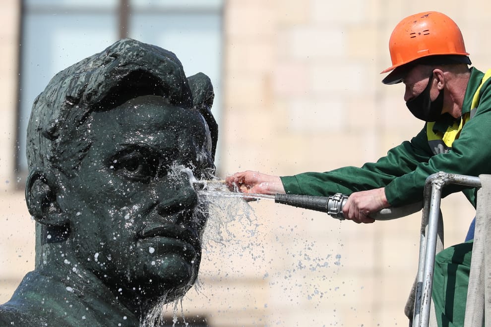 在首都莫斯科,一名清潔人員正用強力水柱沖洗蘇聯著名詩人馬雅可夫斯基(Vladimir Mayakovsky)的雕像。