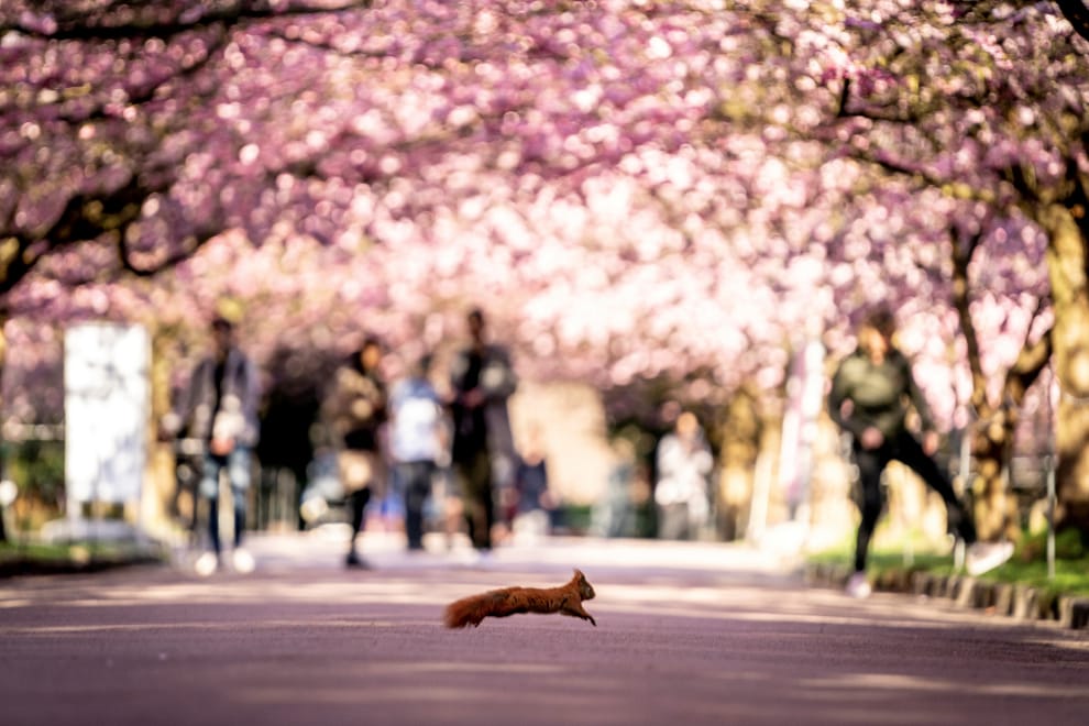 在哥本哈根通往比斯佩布傑格公墓(Bispebjerg Cemetery)的櫻桃巷(Cherry Alley)內,一隻松鼠快速地過街。