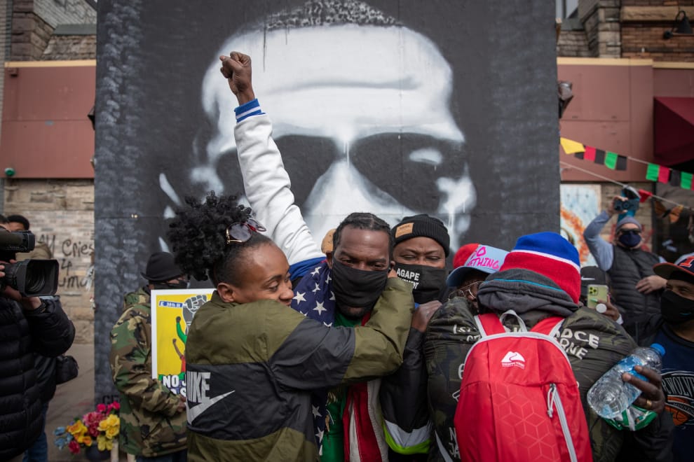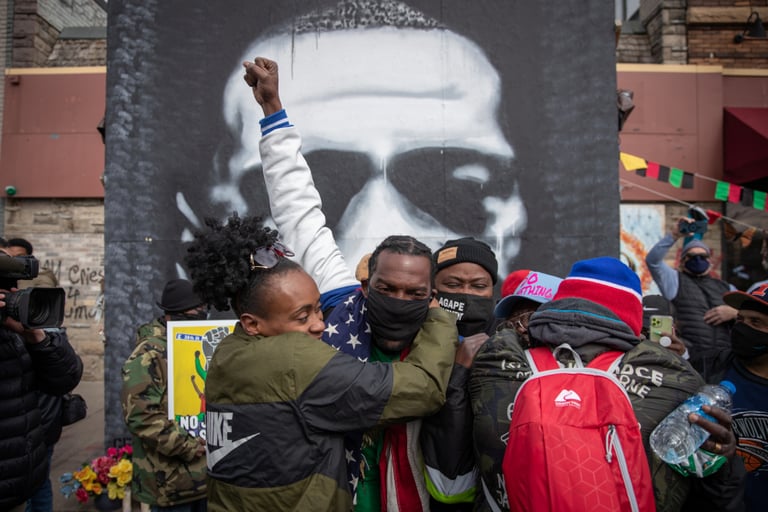 在發生佛洛伊德(George Floyd)事件的明尼蘇達州明尼亞波利斯市(Minneapolis),當地民眾在佛洛伊德紀念廣場上互相擁抱。