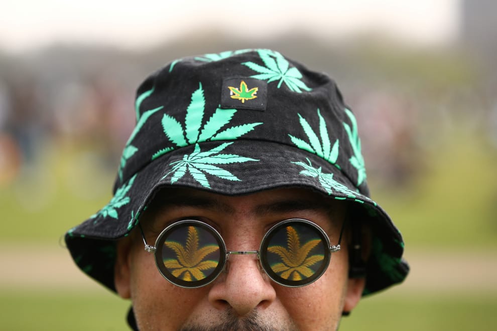 在國際大麻日這天,倫敦海德公園內充滿前來歡慶的民眾,他們的身上都找得到有關大麻的元素,照片中的男子就戴著大麻帽和眼鏡前來共襄盛舉。