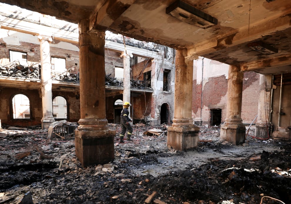 在開普敦大學內,消防人員走進被大火燒得面目全非的圖書館。