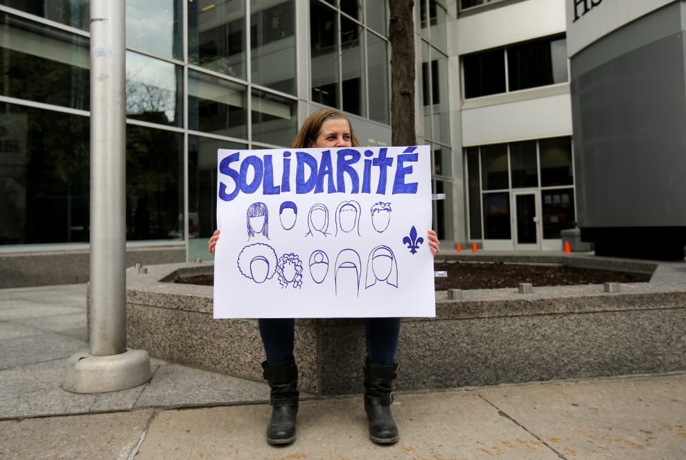 在魁北克省長勒戈(Francois Legault)的辦公室前,一名女子舉起寫有「團結」字樣的海報抗議,上頭畫了不同宗教會佩戴的頭巾和頭飾。