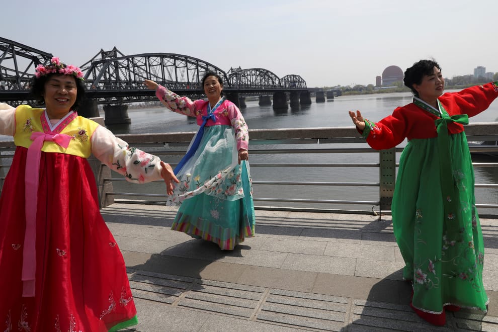在位於遼寧省丹東市、連接北韓的跨國橋樑「中朝友誼橋」旁,觀光客穿著傳統韓服拍照。