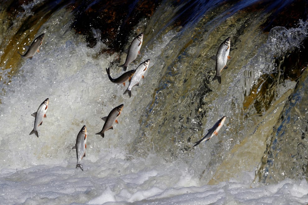 在拉脫維亞西部的庫爾迪加鎮(Kuldiga),一隻隻文鯿(Vimba vimba)試著跳過高兩公尺的文塔瀑布(Venta Rapid),想要回到上游的產卵地繁殖。