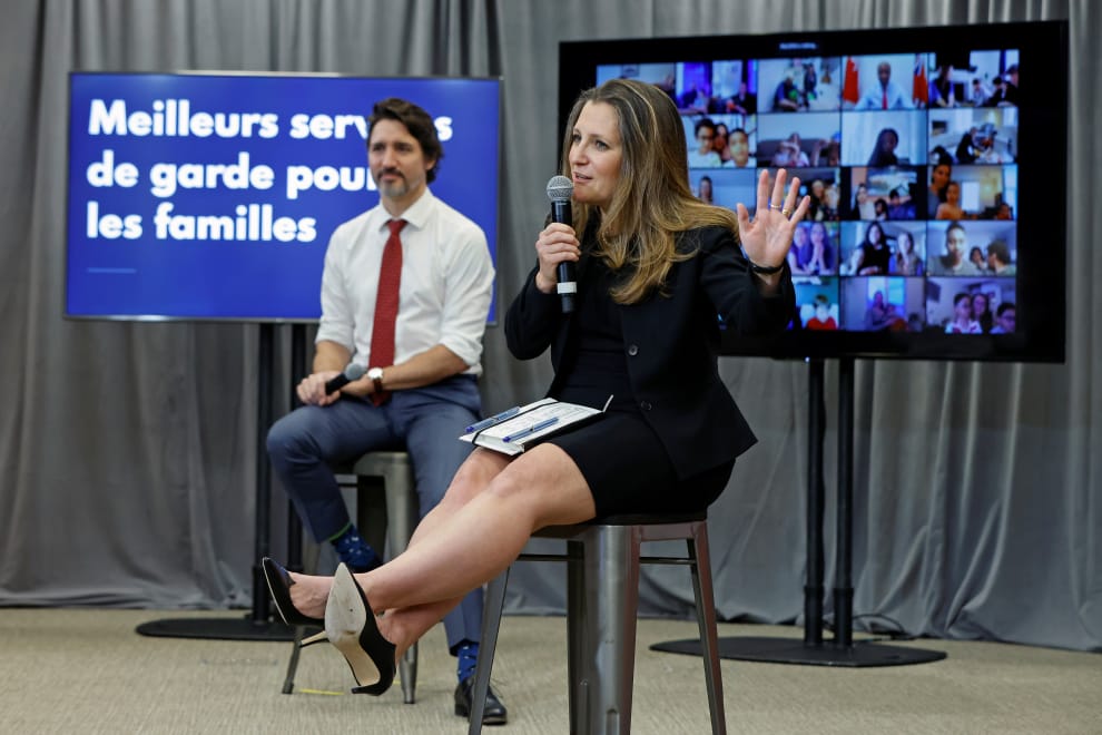 在首都渥太華,加拿大財政部長方慧蘭(Chrystia Freeland)和加拿大總理杜魯道(Justin Trudeau)透過視訊和有孩子的家庭們解釋聯邦預算中預計推行的育兒計畫。