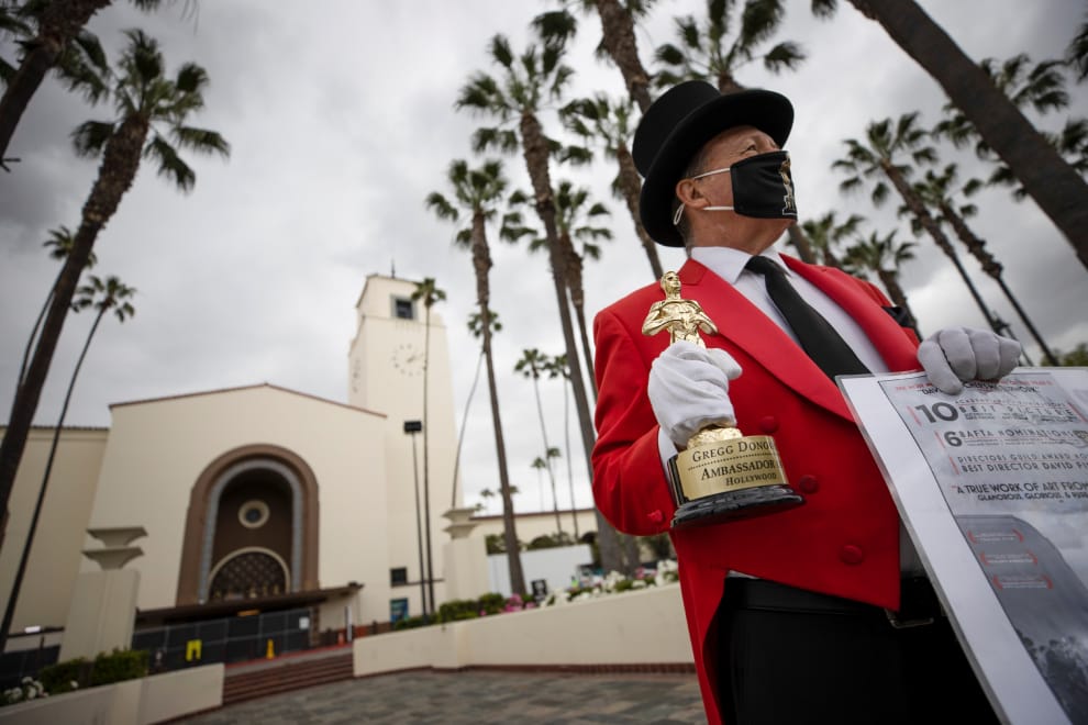 在加州洛杉磯的聯合火車站前,自稱好萊塢大使的多諾萬(Gregg Donovan)手拿奧斯卡小金人獎座的複製品,藉此告訴大家第 93屆奧斯卡金像獎即將在本月 25號登場。