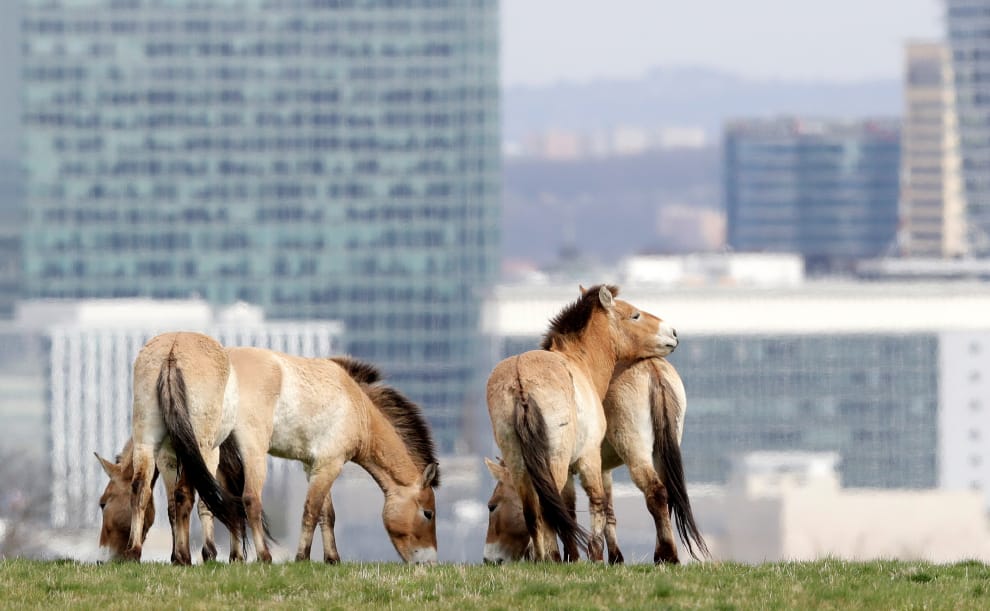 在位於首都布拉格的復育草場,瀕臨絕種的普氏野馬(Przewalski's horses)正在吃草。