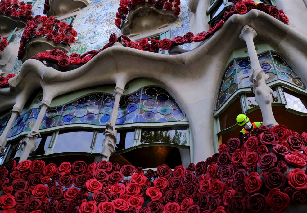 在巴塞隆納著名景點——鬼才建築師高第(Antoni Gaudi)所蓋的巴特略之家(Casa Batllo),工作人員用紅玫瑰裝飾準備迎接 4月23日到來的聖喬治日(Saint George's Day),紀念阻擋羅馬皇帝迫害基督教徒而殉道的聖喬治。