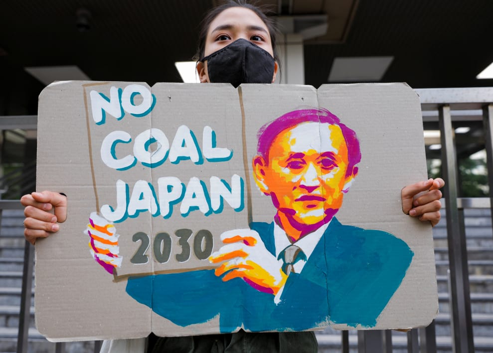 在世界地球日這一天,一名環保人士來到日本經濟產業省大樓外,手持以日本首相菅義偉為靈感的看板,看板上寫著「無碳日本 2030」,藉此呼籲當局儘速往零碳排之路邁進。