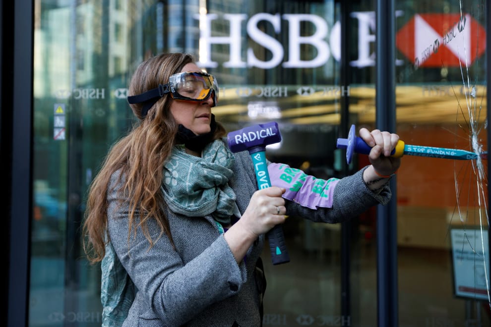 在倫敦金融區的匯豐銀行總部外,一名「滅絕反叛」(Extinction Rebellion)環保組織的成員手拿鐵鎚敲破大樓玻璃,藉此抗議大企業在對抗氣候變遷的努力上還不夠。